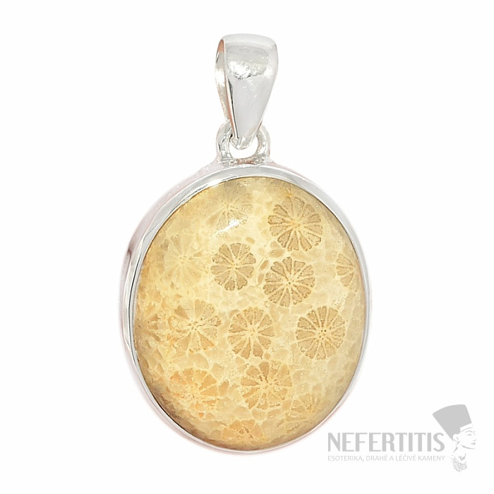 Strieborný prívesok s krásnym indonézskym fosílnym koralom , ktorého kresba pripomína rozvinuté margaréty. kresbou.