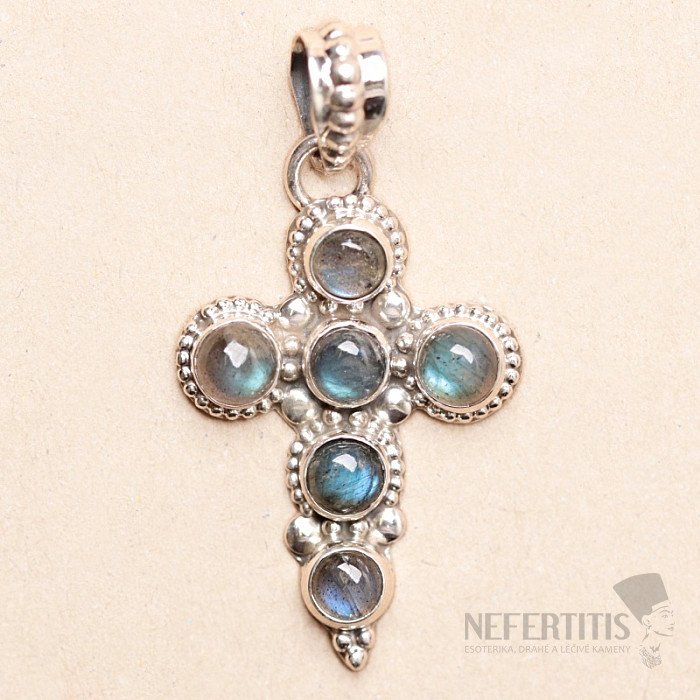 Uchvacujúci a výnimočný strieborný prívesok v tvare kríža s prvotriednym prírodným labradoritom, s výraznou dúhovou hrou farieb, v ktorom sa pri dopade svetla kúzelne rozžiari jasná modro zlatá farba. Ag 925. Nechajte sa očariť krásou a hrou jeho žiarivo modrej farby. Vďaka hre farieb ide o atraktívny a neprehliadnuteľný šperk. Kupujete priamo vyobrazený šperk.