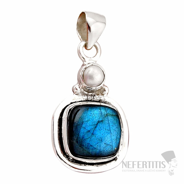 Uchvacujúci a výnimočný strieborný prívesok s prvotriednym prírodným labradoritom s výraznou dúhovou hrou farieb, v ktorom sa pri dopade svetla kúzelne rozžiari jasná modro zlatá farba a bielou perlou. Ag 925. Nechajte sa očariť krásou a hrou žiarivo modrej farby labradoritu. Vďaka hre farieb ide o atraktívny a neprehliadnuteľný šperk. Kupujete priamo vyobrazený šperk.