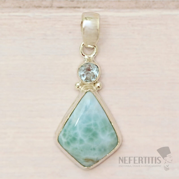 Pôvabný prívesok zo striebra s krásnym a kvalitným kabošonom vzácneho larimaru, ktorý pripomína hru slnečných lúčov na hladine mora, a brúseným modrým topazom . Šperk je ručne vyrobený, larimar je starostlivo vybraný so zreteľne modrým vyfarbením. Ag 925. Kupujete priamo vyobrazený šperk.