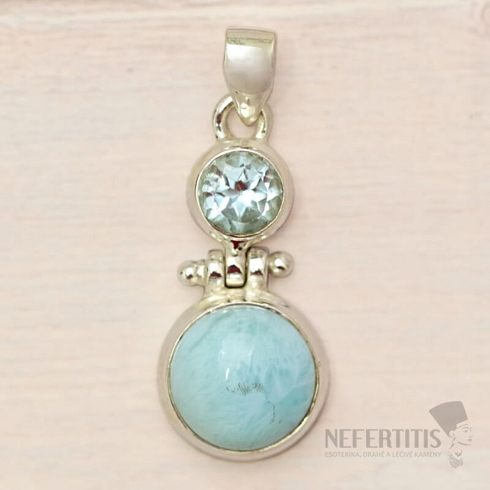 Pôvabný prívesok zo striebra s krásnym a kvalitným kabošonom vzácneho larimaru, ktorý pripomína hru slnečných lúčov na hladine mora, a brúseným modrým topazom . Šperk je ručne vyrobený, larimar je starostlivo vybraný so zreteľne modrým vyfarbením. Ag 925. Kupujete priamo vyobrazený šperk.