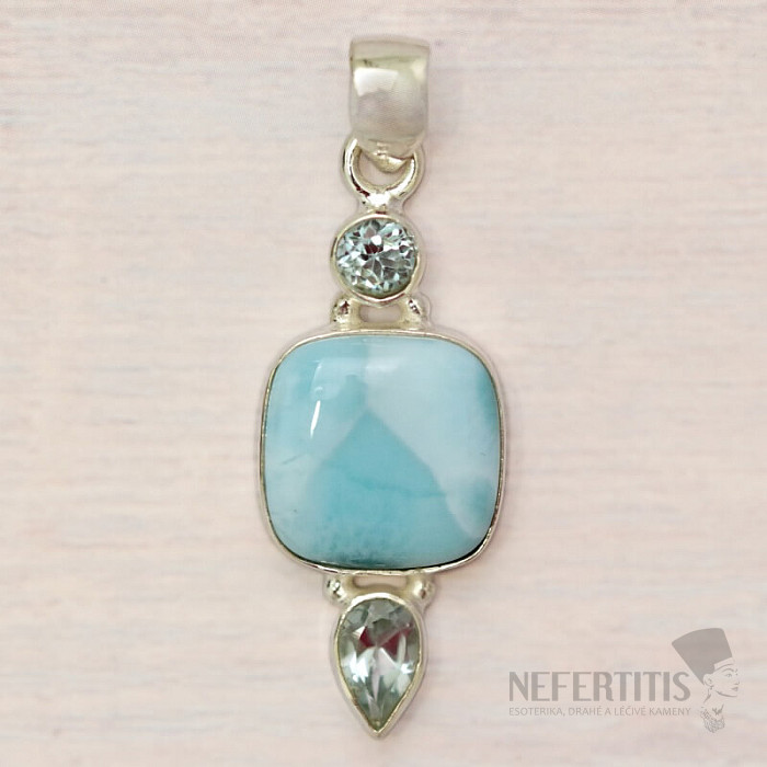 Pôvabný prívesok zo striebra s krásnym a kvalitným kabošonom vzácneho larimaru, ktorý pripomína hru slnečných lúčov na hladine mora, a brúsenými modrými topazmi. Šperk je ručne vyrobený, larimar je starostlivo vybraný so zreteľne modrým vyfarbením. Ag 925. Kupujete priamo vyobrazený šperk.
