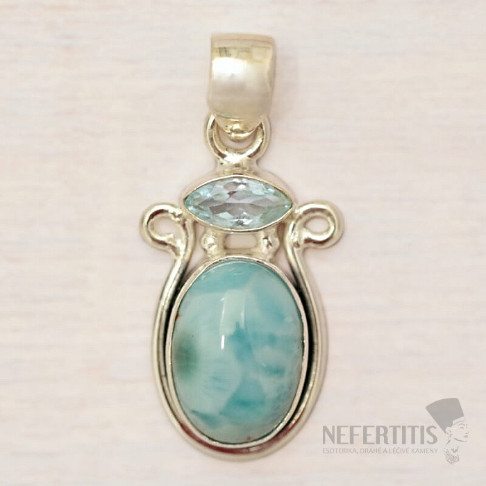 Pôvabný prívesok zo striebra s krásnym a kvalitným kabošonom vzácneho larimaru, ktorý pripomína hru slnečných lúčov na hladine mora, a brúseným modrým topazom . Šperk je ručne vyrobený, larimar je starostlivo vybraný so zreteľne modrým vyfarbením. Ag 925. Kupujete priamo vyobrazený šperk.