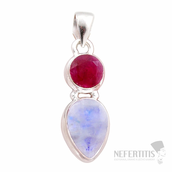 Výnimočne krásny, strieborný prívesok s brúseným dúhovým mesačným kameňom a brúseným indickým rubínom. Ag 925. Mesačný kameň vám vnesie do života nielen kúzlo svojich farieb, ale predovšetkým lásku, vášeň, túžbu, ochranu, múdrosť, a zároveň tiež zmierenie a pokoj. Kupujete priamo vyobrazený šperk.