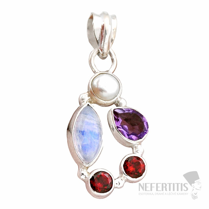 Výnimočne krásny, strieborný prívesok s dúhovým mesačným kameňom, brúseným ametystom, perlou a brúsenými granátmi. Mesačný kameň vám vnesie do života nielen kúzlo svojich farieb, ale predovšetkým lásku, vášeň, túžbu, ochranu, múdrosť, a zároveň aj zmierenie a pokoj. Ag 925. Kupujete priamo vyobrazený šperk.
