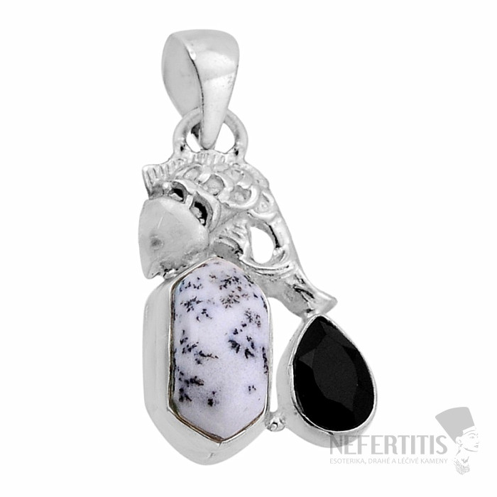 Pôvabný strieborný prívesok s dentritickým opálom , ktorý svojou bielou a šedou farbou a krásnou kresbou inklúzií navodzuje predstavu zasneženej krajiny ako z pera dávnych čínskych kresliarov krajín, a brúseným onyxom. Nežný a jemný a napriek tomu výrazný a atraktívny šperk. Mimoriadne pekný kameň, aký máme v ponuke len zriedka kedy. Ag 925. Kupujete priamo vyobrazený šperk.