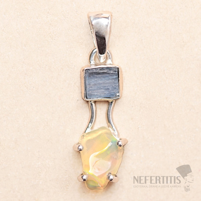 Elegantný strieborný prívesok zo surového, zalešteného opálu, s krásnou hrou farieb, a kryštálu modrého kyanitu. Ag 925. Pôsobivý a elegantný šperk, od pohľadu navodzujúci radosť a pocity harmónie. Etiópske opály oproti… viac »