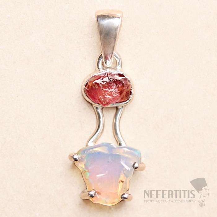Elegantný strieborný prívesok zo surového, zalešteného opálu, s krásnou hrou farieb, a surového ružového turmalínu . Ag 925. Pôsobivý a elegantný šperk, od pohľadu navodzujúci radosť a pocity harmónie. Etiópske opály oproti austrálskym opálom doslova hýria až neónovo žiarivými odleskami farieb. Hoci na prvý pohľad na to nevyzerajú, ohňostroj farieb, ktorý z opálu v tomto prívesku vytryskne pri každom dopade svetla, očarí nielen vás, ale celé vaše okolie. Kupujete priamo vyobrazený šperk.