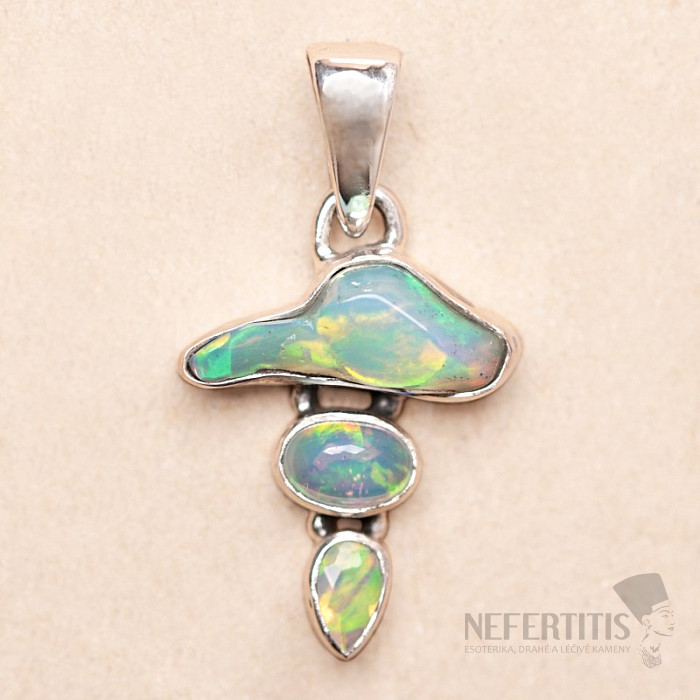 Moderný a elegantný strieborný prívesok s etiópskym opálom v troch variantoch - surovým zalešteným, lešteným kabošonom, a brúsenou kvapkou, s krásnou hrou farieb. Ag 925. Pôsobivý a elegantný šperk, od pohľadu navodzujúci radosť a pocity harmónie. Etiópske opály oproti austrálskym opálom doslova hýria až neónovo žiarivými odleskami farieb. Hoci na prvý pohľad na to nevyzerajú, ohňostroj farieb, ktorý z opálu v tomto prívesku vytryskne pri každom dopade svetla, očarí nielen vás, ale celé vaše okolie. Kupujete priamo vyobrazený šperk.