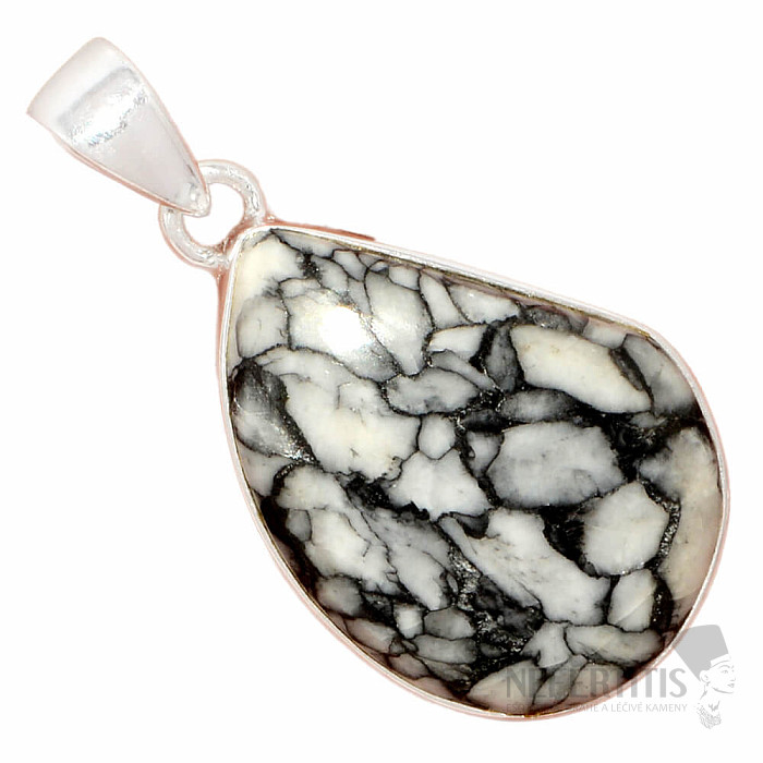 Strieborný prívesok s dekoratívnym vzácnym pinolitom zasadeným do strieborného rámčeka. Ag 925. Pinolit s ymbolizuje predovšetkým mužský aspekt. Pinolit je grafitom pigmentovaný, svetlo šedý až takmer čierny dolomit s inklúziami bielych magnezitových zŕn, ktoré pripomínajú semená borovíc a odtiaľ je odvodený názov pinolitu, pretože borovica po latinsky je "pinus". Kupujete priamo vyobrazený šperk.