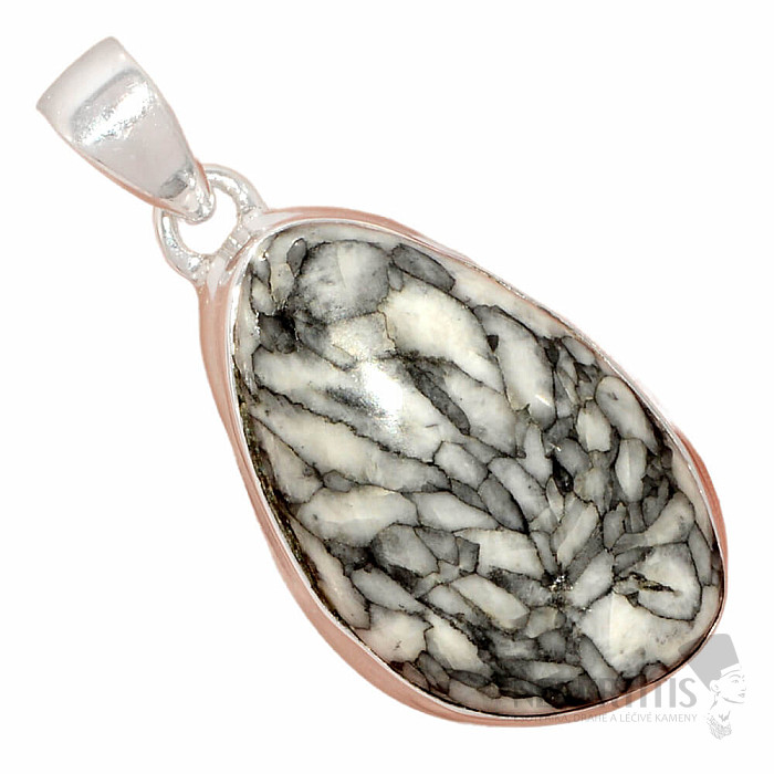 Strieborný prívesok s dekoratívnym vzácnym pinolitom zasadeným do strieborného rámčeka. Ag 925. Pinolit s ymbolizuje predovšetkým mužský aspekt. Pinolit je grafitom pigmentovaný, svetlo šedý až takmer čierny dolomit s inklúziami bielych magnezitových zŕn, ktoré pripomínajú semená borovíc a odtiaľ je odvodený názov pinolitu, pretože borovica po latinsky je "pinus". Kupujete priamo vyobrazený šperk.