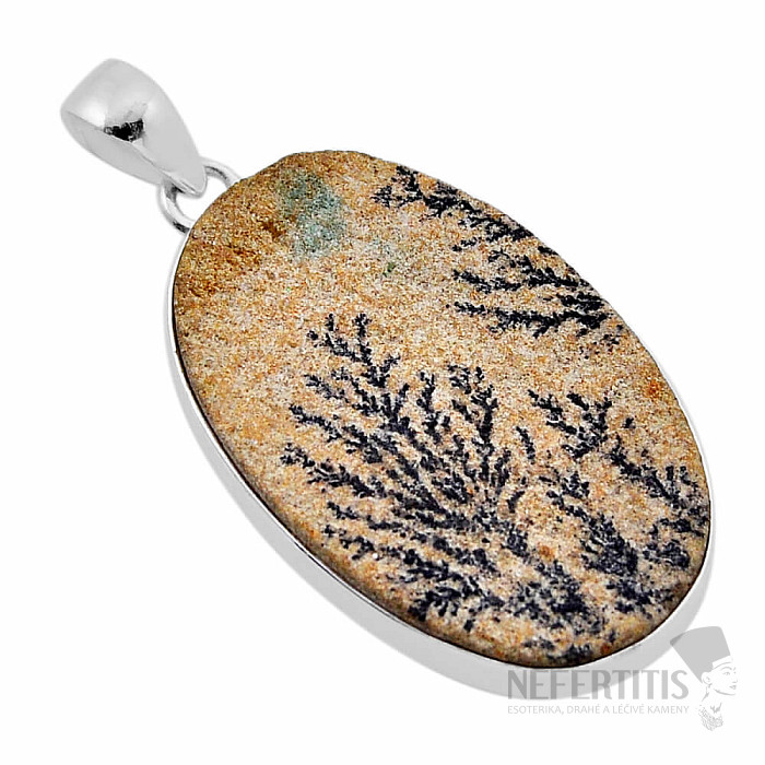 Strieborný prívesok s nemeckým dendritickým psilomelanom s nádhernou kresbou, pripomínajúci vetvy stromov či kríky v prvotriednej kvalite. Ag 925. V krásne prevedenom striebornom rámčeku predstavuje naozaj neprehliadnuteľný šperk! Okrová farba v kombinácii s čiernymi "rastlinkami" robí z tohto prívesku unikátny šperk! Kupujete priamo vyobrazený šperk.