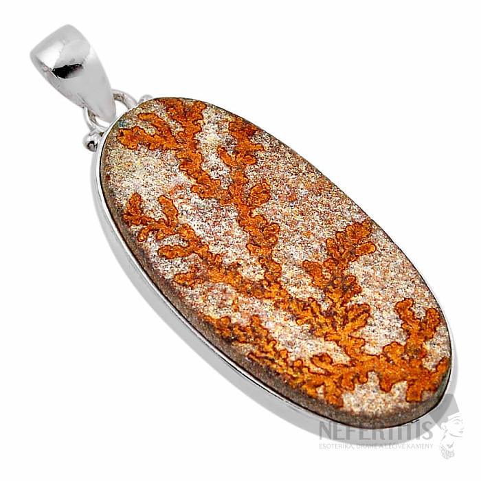 Strieborný prívesok s nemeckým dendritickým psilomelanom s nádhernou kresbou, pripomínajúci vetvy stromov či kríky v prvotriednej kvalite. Ag 925. V krásne prevedenom striebornom rámčeku predstavuje naozaj neprehliadnuteľný šperk! Okrová farba v kombinácii s čiernymi "rastlinkami" robí z tohto prívesku unikátny šperk! Kupujete priamo vyobrazený šperk.