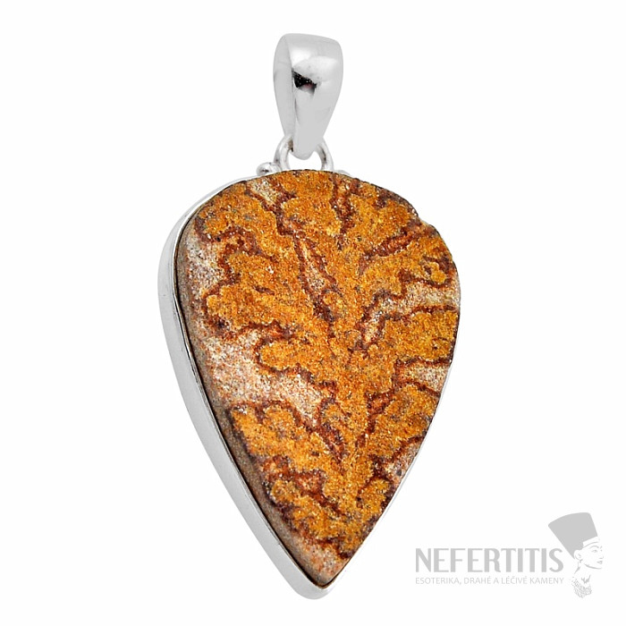 Strieborný prívesok s nemeckým dendritickým psilomelanom s nádhernou kresbou, pripomínajúci vetvy stromov či kríky v prvotriednej kvalite. Ag 925. V krásne prevedenom striebornom rámčeku predstavuje naozaj neprehliadnuteľný šperk! Okrová farba v kombinácii s čiernymi "rastlinkami" robí z tohto prívesku unikátny šperk! Kupujete priamo vyobrazený šperk.
