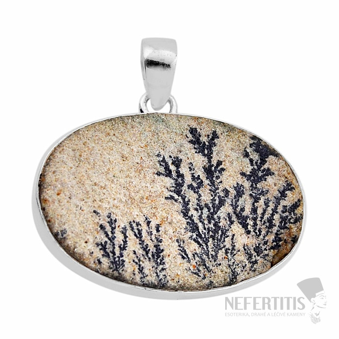 Strieborný prívesok s nemeckým dendritickým psilomelanom s nádhernou kresbou, pripomínajúci vetvy stromov či kríky v prvotriednej kvalite. Ag 925. V krásne prevedenom striebornom rámčeku predstavuje naozaj neprehliadnuteľný šperk! Okrová farba v kombinácii s čiernymi "rastlinkami" robí z tohto prívesku unikátny šperk! Kupujete priamo vyobrazený šperk.