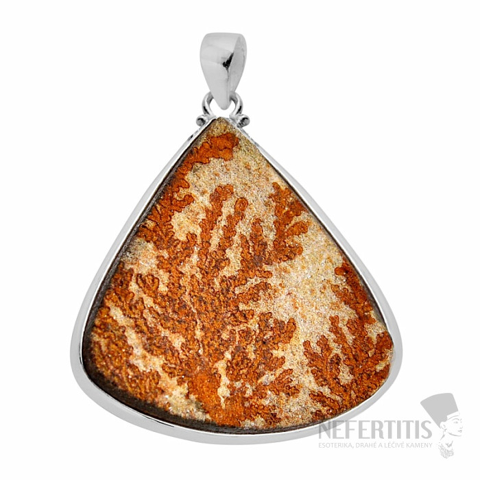 Strieborný prívesok s nemeckým dendritickým psilomelanom s nádhernou kresbou, pripomínajúci vetvy stromov či kríky v prvotriednej kvalite. Ag 925. V krásne prevedenom striebornom rámčeku predstavuje naozaj neprehliadnuteľný šperk! Okrová farba v kombinácii s čiernymi "rastlinkami" robí z tohto prívesku unikátny šperk! Kupujete priamo vyobrazený šperk.