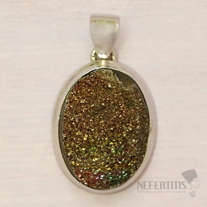 Nádherný strieborný prívesok s dúhovou pyritovou drôzičkou . Dúhový pyrit je pomerne vzácny a za svoju úchvatnú farbu vďačí zvýšenému obsahu železa. Ag 925. Kupujete priamo vyobrazený šperk.