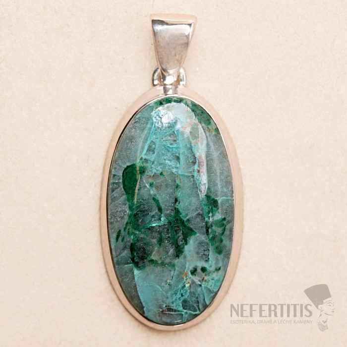 Pôvabný strieborný prívesok so vzácnym a zberateľsky ceneným prírodným Quantum quattro. Ag 925. Quantum quattro je kombináciou štyroch minerálov - shattuckitu, dioptasu, malachitu a chryzokolu. Každý šperk je originálny, neopakovateľný a vďaka farebnej kombinácii a usporiadaniu minerálov podnecuje fantáziu, pripomína pohľad na Zem z vtáčej perspektívy. Budete mať krásny šperk, ktorý nikto neprehliadne, vhodný na rôzne príležitosti. Kupujete priamo vyobrazený šperk.