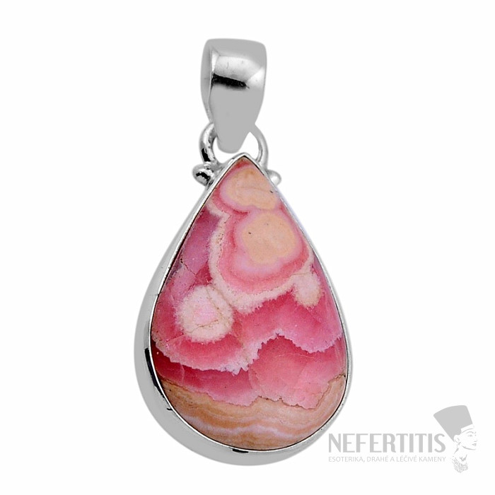 Strieborný prívesok s rodochrozitom. Ag 925. Tento pôvabo prevedený jemný šperk je osadený výnimočne kvalitným ružovým rodochrozitom zvláštnej krásy s nádhernou kresbou. Výnimočný šperk, ktorý očarí snáď každú ženu. Kupujete priamo vyobrazený šperk.