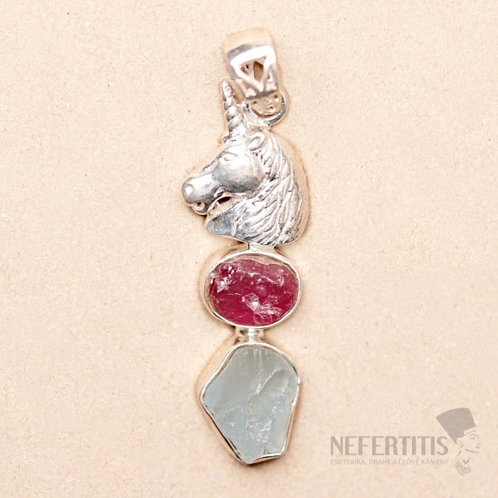 Strieborný prívesok so surovým rubínom, doplneným o akvamarín nielen lahodí oku svojou krásnou farbou, ale predovšetkým prináša pokoj, radosť a šťastie. Ag 925. Kupujete priamo vyobrazený šperk.