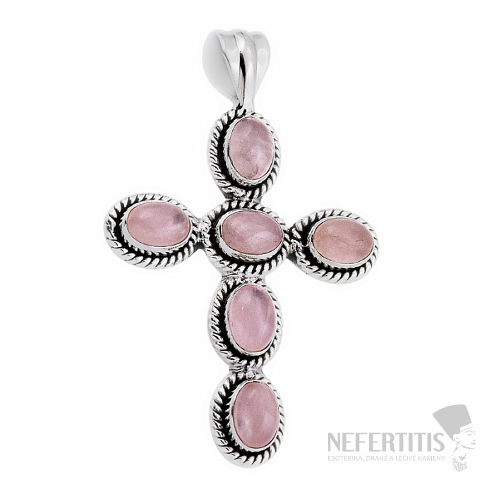 Strieborný prívesok v tvare kríža s kabošonmi ruženínu. Ag 925. Kupujete priamo vyobrazený šperk. Ružová farba je farbou novej lásky, novej romantiky a nových vzťahov. Podporuje zmyselnosť, môže pomôcť prekonať… viac »