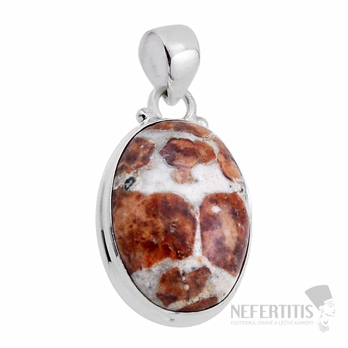 Pôvabný strieborný prívesok so spessartinom vo vápenci. Ag 925. Atraktívny šperk vďaka kombinácii farieb spessartinu - červenej až červenohnedej a smotanovej farby vápenca. Kupujete priamo vyobrazený šperk.