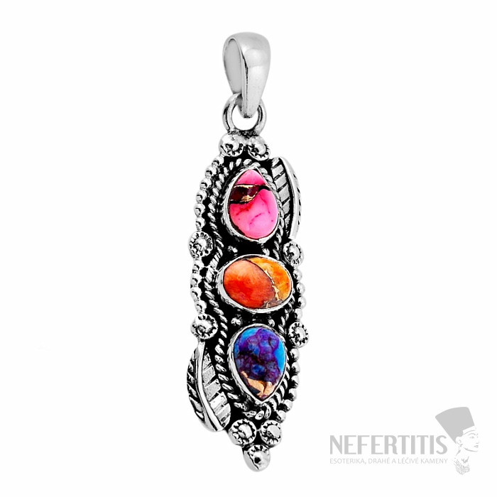Unikátny strieborný prívesok z kúskov lastúr a prírodného tyrkysu. Ag 925. Šperk je vyrobený z farebných častí lastúr a prírodného tyrkysu, spojených dohromady meďou do pôsobivých kabošonov. Každá mozaika je originálna farbami a tým aj kresbou. Nádherná kombinácia farieb dáva šperku originalitu a neprehliadnuteľnosť. Kupujete priamo vyobrazený šperk.