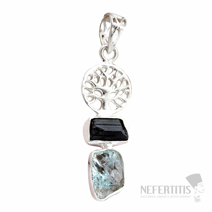 Turmalín skoryl a surový akvamarín prívesok striebro Ag 925 48209