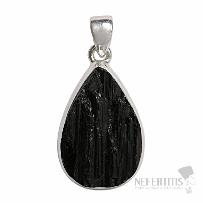 Atraktívny, elegantný, až trochu tajomný prívesok z veľkého surového čierneho turmalínu skorylu v striebre. Čierna farba turmalínu, ktorá krásne kontrastuje s leskom strieborného rámčeka, dáva tomuto prívesku eleganciu a robí z neho veľmi dekoratívny šperk. Čierne surové turmalíny bežne obsahujú prasklinky, je to ich charakteristický rys a dôkaz, že kupujete pravý prírodný tumalín. Ag 925. Kupujete priamo vyobrazený šperk.