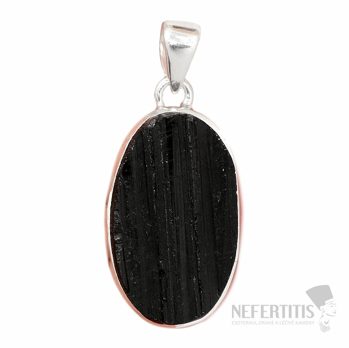 Atraktívny, elegantný, až trochu tajomný prívesok z veľkého surového čierneho turmalínu skorylu v striebre. Čierna farba turmalínu, ktorá krásne kontrastuje s leskom strieborného rámčeka, dáva tomuto prívesku eleganciu a robí z neho veľmi dekoratívny šperk. Čierne surové turmalíny bežne obsahujú prasklinky, je to ich charakteristický rys a dôkaz, že kupujete pravý prírodný tumalín. Ag 925. Kupujete priamo vyobrazený šperk.