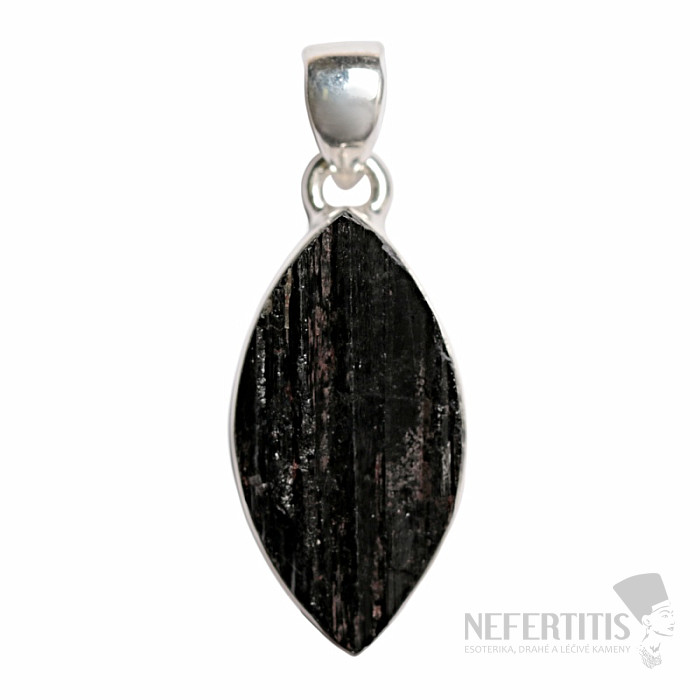 Atraktívny, elegantný, až trochu tajomný prívesok z veľkého surového čierneho turmalínu skorylu v striebre. Čierna farba turmalínu, ktorá krásne kontrastuje s leskom strieborného rámčeka, dáva tomuto prívesku eleganciu a robí z neho veľmi dekoratívny šperk. Čierne surové turmalíny bežne obsahujú prasklinky, je to ich charakteristický rys a dôkaz, že kupujete pravý prírodný tumalín. Ag 925. Kupujete priamo vyobrazený šperk.