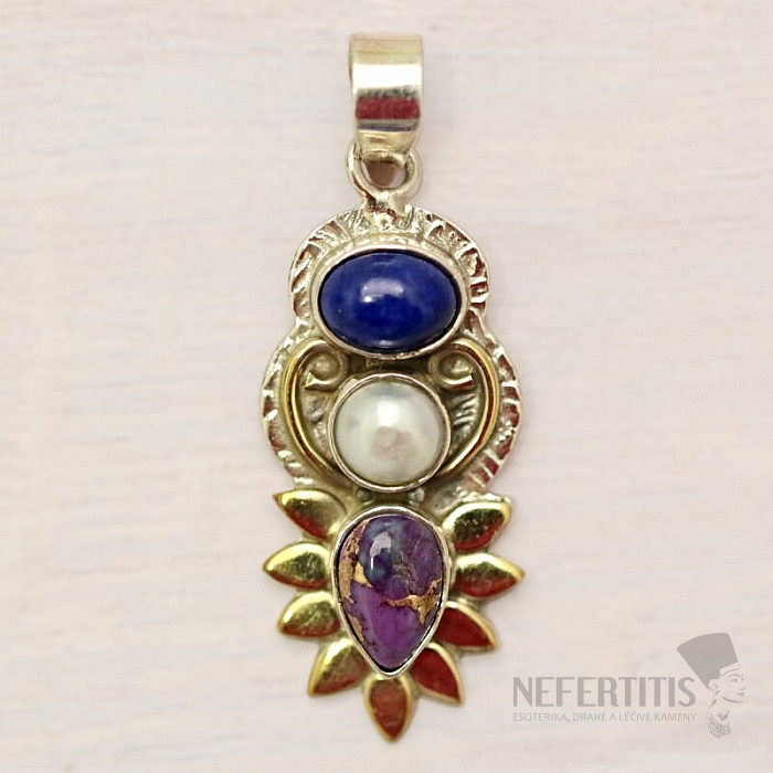 Výnimočný strieborný, čiastočne pozlátený, prívesok s kúskami prírodného, farbeného tyrkysu , spájaných meďou do pôsobivého kabošonu krásnej purpurovo-fialovej farby, s ametystom a perlou . Tento typ šperkov získava vo svete na veľkej obľube z dôvodu stále rastúcej ceny jednoliatych kusov prírodného tyrkysu. Takto vytvárané kabošony sú jednou z mála možností, ako si dnes zaobstarať šperk s prírodným tyrkysom za relatívne dostupnú cenu. Ag 925. Kupujete priamo vyobrazený šperk.