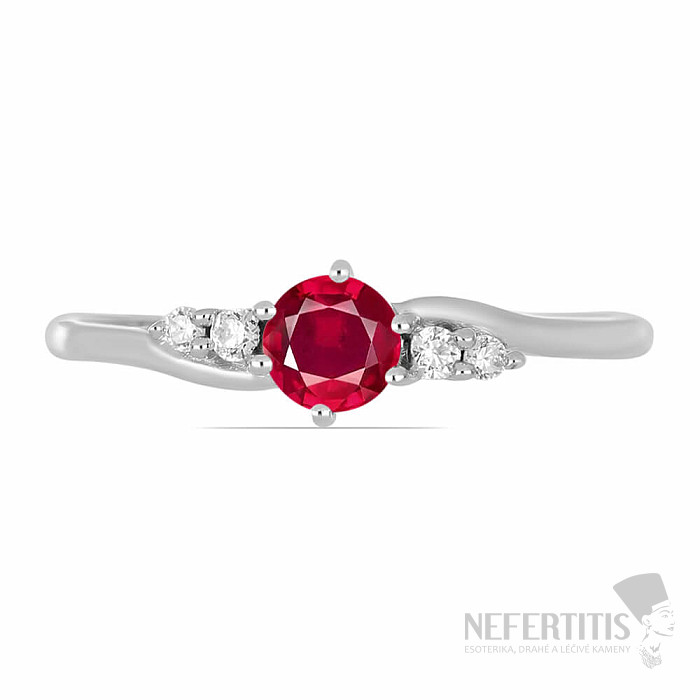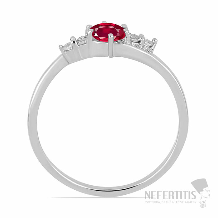 Exkluzívny strieborný prsteň z dizajnového radu Nefertitis Collection s brúseným prírodným rubínom a kubickými zirkónmi. Kamene sú zasadené do rhodiovaného striebra , ktorého povrch pripomína vzhľad bieleho zlata, prsteň tak pôsobí luxusným dojmom. Rhodiované striebro je menej náchylné na oxidáciu (černanie) povrchu. Krásny trblietavý šperk s čírym kameňom klenotníckej kvality, ktorého krása je zdôraznená dopadom svetla na jednotlivé plôšky výbrusu, vhodný na rôzne príležitosti. Rhodiované striebro Ag 925/1000. Veľkosť rubínu cca 0,5 cm. Ilustratívne vyobrazenie.