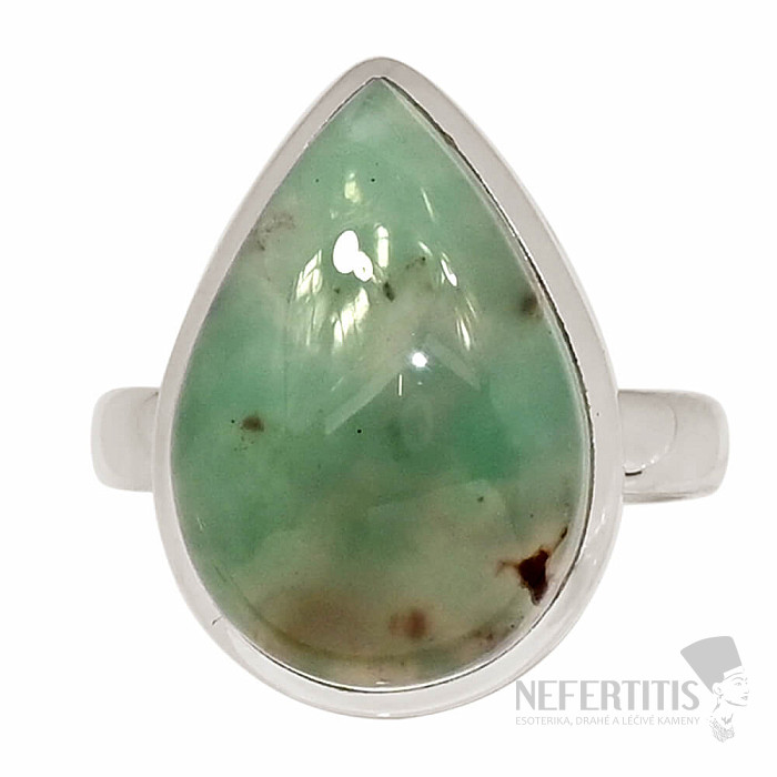 Krásny strieborný prsteň zo vzácneho akvaprasu. Ag 925. Akvapras je nádhernou odrodou chalcedónu, pochádzajúcou z Afriky, kombinujúcou v sebe modrozelenú a hnedú farbu. Vďaka nezvyčajnej kombinácii farieb, blankytne modrej v kombinácii so zelenou a hnedou je každý kus unikátny, niektorý môže obsahovať mliečne biele inklúzie pripomínajúce morské vlny, alebo ostrovy plávajúce v mori, alebo mraky na oblohe. Vďaka vzhľadu je kameň nezvyčajne krásny a neprehliadnuteľný. Veľkosť kameňa je cca 1,9 cm . Kupujete priamo vyobrazený šperk.