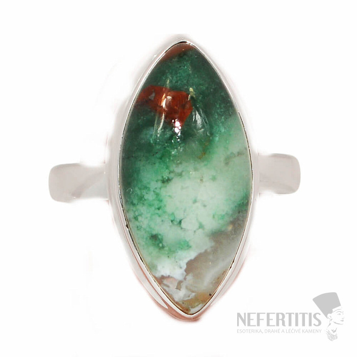 Krásny strieborný prsteň zo vzácneho akvaprasu. Ag 925. Akvapras je nádhernou odrodou chalcedónu, pochádzajúcou z Afriky, kombinujúcou v sebe modrozelenú a hnedú farbu. Vďaka nezvyčajnej kombinácii farieb, blankytne modrej v kombinácii so zelenou a hnedou je každý kus unikátny, niektorý môže obsahovať mliečne biele inklúzie pripomínajúce morské vlny, alebo ostrovy plávajúce v mori, alebo mraky na oblohe. Vďaka vzhľadu je kameň nezvyčajne krásny a neprehliadnuteľný. Veľkosť kameňa je cca 2,3 cm . Kupujete priamo vyobrazený šperk.
