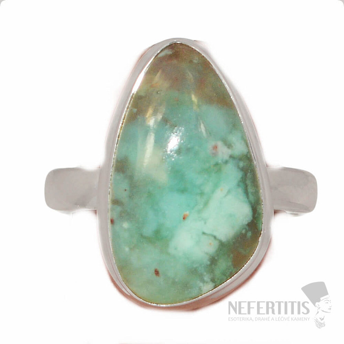 Krásny strieborný prsteň zo vzácneho akvaprasu. Ag 925. Akvapras je nádhernou odrodou chalcedónu, pochádzajúcou z Afriky, kombinujúcou v sebe modrozelenú a hnedú farbu. Vďaka nezvyčajnej kombinácii farieb, blankytne modrej v kombinácii so zelenou a hnedou je každý kus unikátny, niektorý môže obsahovať mliečne biele inklúzie pripomínajúce morské vlny, alebo ostrovy plávajúce v mori, alebo mraky na oblohe. Vďaka vzhľadu je kameň nezvyčajne krásny a neprehliadnuteľný. Veľkosť kameňa je cca 2 cm . Kupujete priamo vyobrazený šperk.