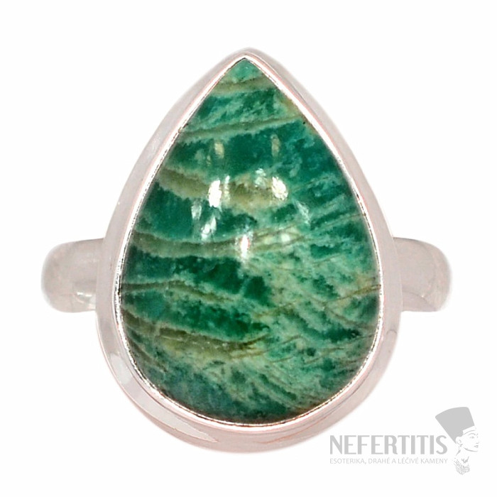 Nádherný strieborný prsteň s krásne prefarbeným amazonitom z Peru, ktorý pripomína svoju tyrkysovo zelenú farbu hlbokú priezračnú vodu. Ag 925. Veľkosť kameňa cca 1,8 cm. Kupujete priamo vyobrazený šperk.