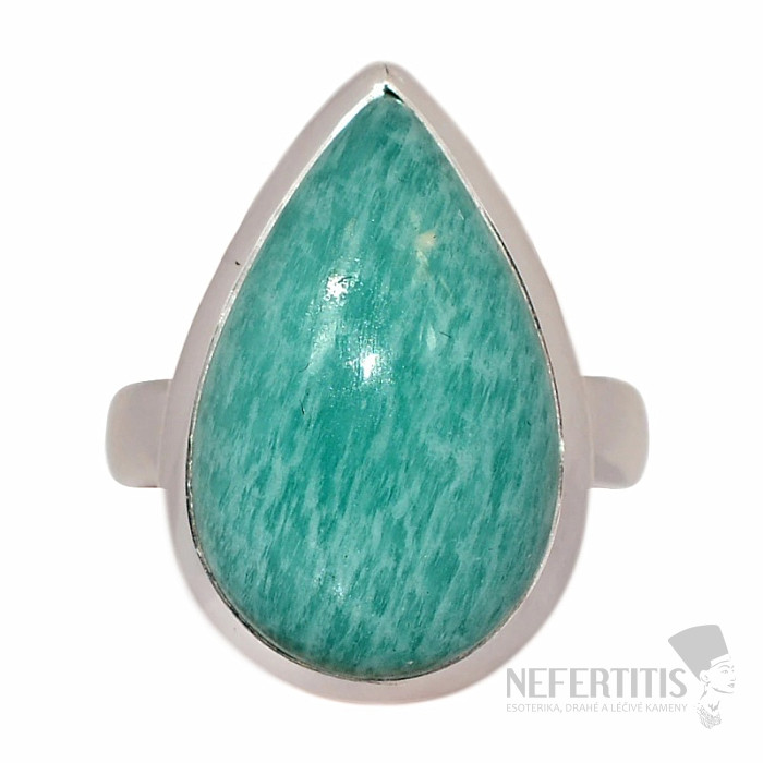 Nádherný strieborný prsteň s krásne prefarbeným amazonitom z Peru, ktorý pripomína svoju tyrkysovo zelenú farbu hlbokú priezračnú vodu. Ag 925. Veľkosť kameňa cca 2,2 cm. Kupujete priamo vyobrazený šperk.