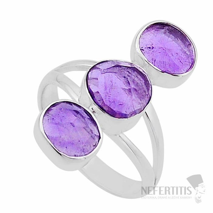 Krásny prsteň zo striebra s brúsenými ametystmi . Ag 925. Nesmierne elegantný šperk, ktorý každého očarí a nikto ho na vašej ruke neprehliadne. Veľkosť častí s kameňmi cca 2,4 cm. Kupujete priamo vyobrazený šperk.
