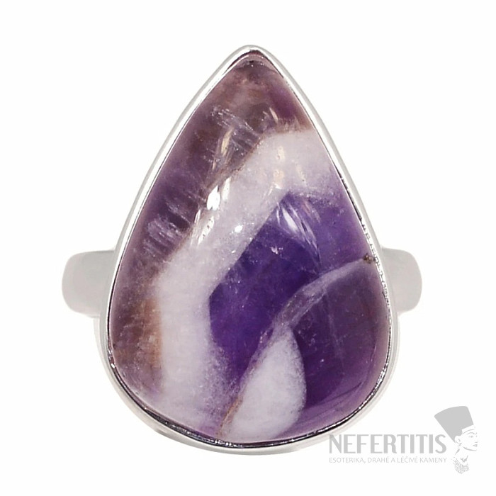 Krásny prsteň zo striebra s kabošonom ametystu chevron . Ag 925. Nesmierne elegantný šperk, ktorý každého očarí a nikto ho na vašej ruke neprehliadne. Chevron je odrodou ametystu s výraznou bielou kresbou v tmavo fialovom kameni, ktorá robí tento druh ametystu tak atraktívnym. Kupujete priamo vyobrazený šperk. Veľkosť kameňa cca 2,2 cm.