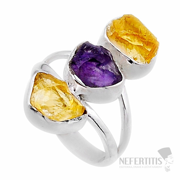 Nádherný strieborný prsteň s krásnymi surovými citríny a surovým ametystom. Ag 925. Veľkosť časti s kameňmi cca 2,4 cm. Kupujete priamo vyobrazený šperk.