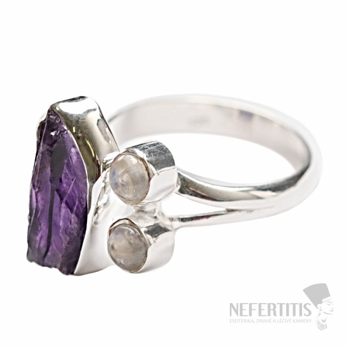 Strieborný dizajnový prsteň s surovým ametystom a mesačnými kameňmi . Ag 925. Tento prsteň je obzvlášť krásny nielen svojim tvarom, ale predovšetkým svojim spracovaním. Veľkosť ametystu cca 2,2 cm . Kupujete priamo vyobrazený šperk.