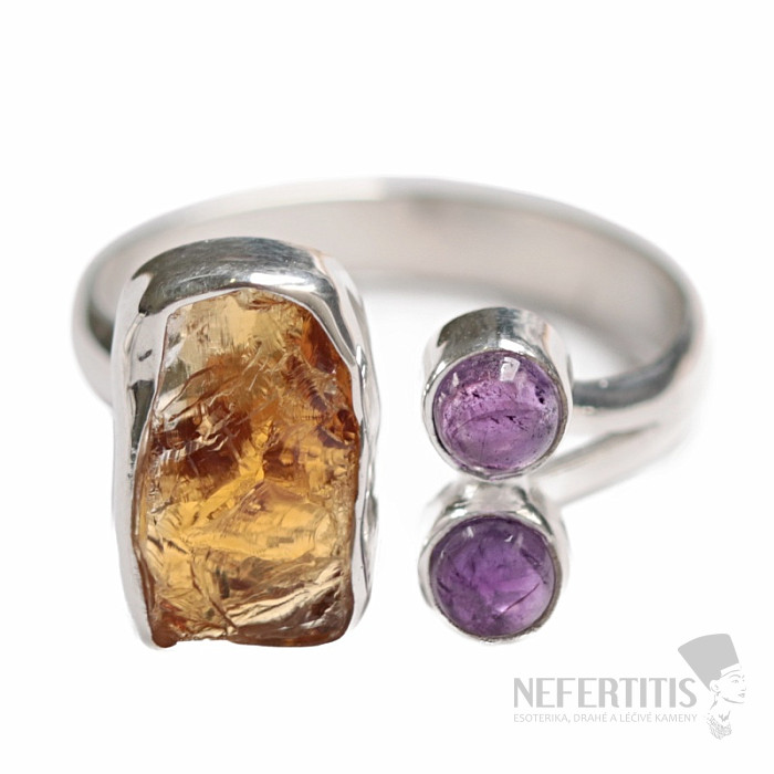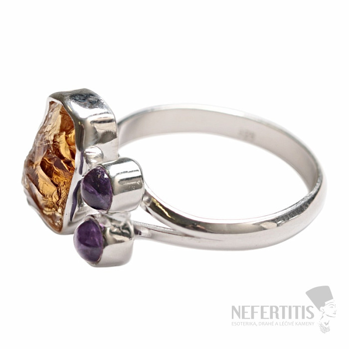 Strieborný dizajnový prsteň so surovým citrínom a ametystmi . Ag 925. Tento prsteň je obzvlášť krásny nielen svojim tvarom, ale predovšetkým svojim spracovaním. Veľkosť citrínu cca 1,3 cm . Kupujete priamo vyobrazený šperk.