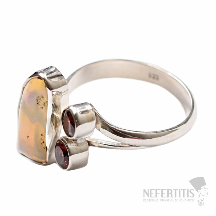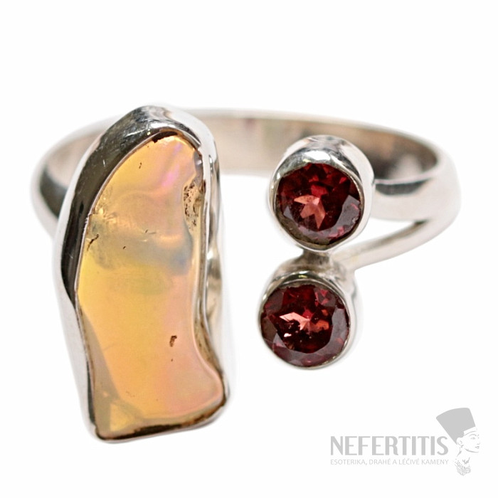 Strieborný dizajnový prsteň s etiópskym opálom a brúsenými granátmi. Ag 925. Tento prsteň je obzvlášť krásny nielen svojim tvarom, ale predovšetkým svojim spracovaním. Veľkosť časti s kameňmi cca 2,2 cm . Kupujete priamo vyobrazený šperk.