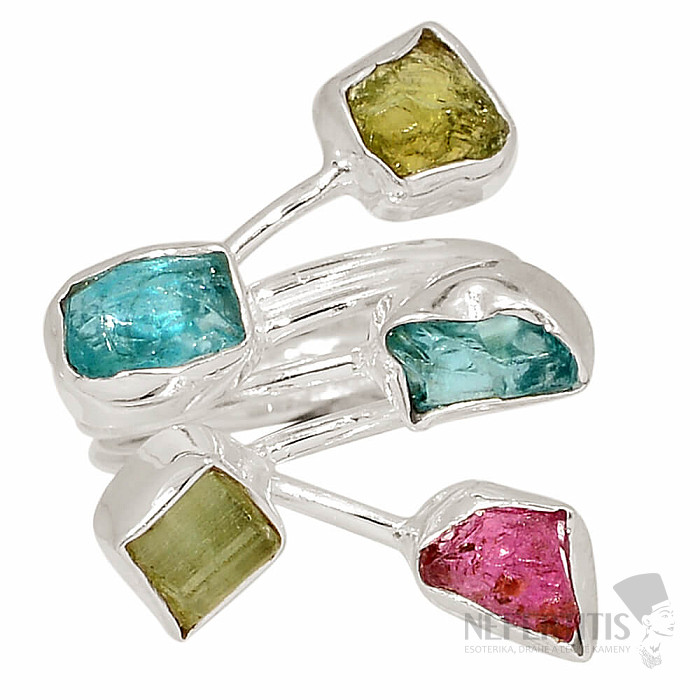 Strieborný dizajnový prsteň s rôzne farebnými turmalínmi, olivínom a apatitmi. Ag 925. Očarujúce, veselo pôsobiaci šperk s iskrivými farbami nádherných prírodných turmalínov. Tento prsteň je obzvlášť krásny nielen svojim tvarom, ale predovšetkým svojim spracovaním. Veľkosť časti s kameňmi cca 2,6 cm . Kupujete priamo vyobrazený šperk.