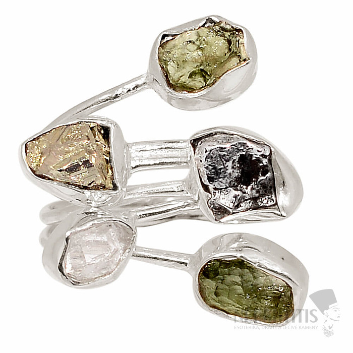 Strieborný dizajnový prsteň so surovými vltavínami, herkimer diamantom a Meteority Campo del Cielo. Ag 925. Tento prsteň je obzvlášť krásny nielen svojim tvarom, ale predovšetkým svojim spracovaním. Veľkosť časti s kameňmi cca 2,3 cm . Kupujete priamo vyobrazený šperk.