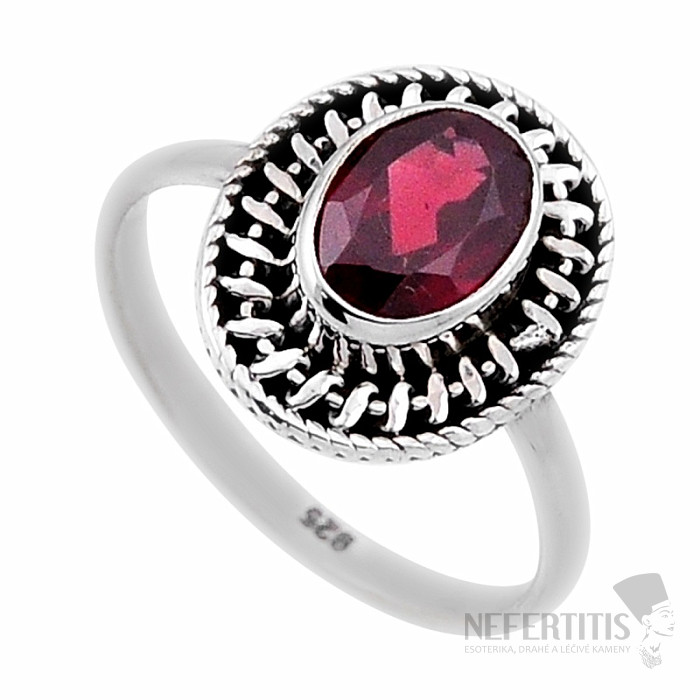 Strieborný prsteň s brúseným granátom. Ag 925. Výrazný prsteň, ktorého krásu umocňuje trblietanie svetla na jednotlivých brúsených plôškach. Veľkosť kameňa cca 0,9 cm. Kupujete priamo vyobrazený šperk.