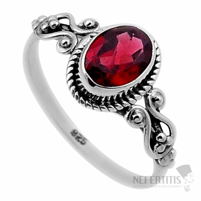 Strieborný prsteň s brúseným granátom. Ag 925. Výrazný prsteň, ktorého krásu umocňuje trblietanie svetla na jednotlivých brúsených plôškach. Veľkosť kameňa cca 0,8 cm. Kupujete priamo vyobrazený šperk.