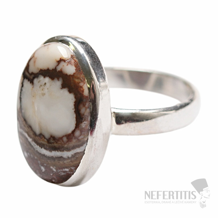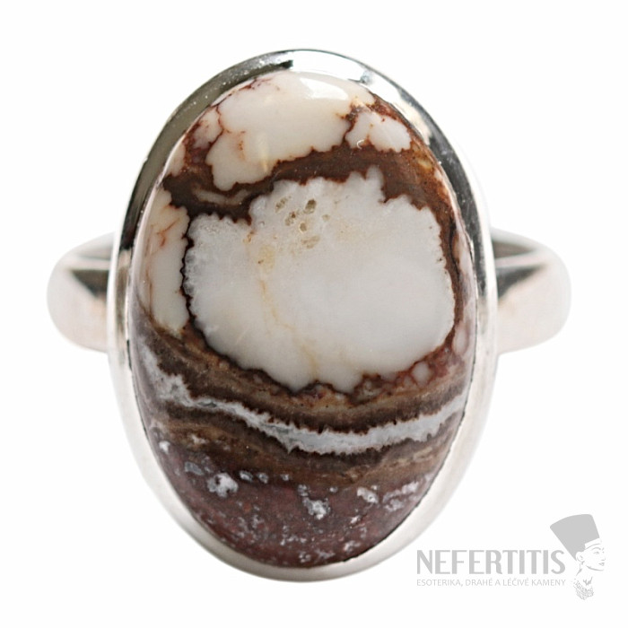 Strieborný prsteň s magnezitom Wild horse, nachádzajúcim sa v Arizone. Ag 925. Tento druh magnezitu má neopakovateľnú, nezameniteľnú kresbu - krásne mramorovanie v bielom magnezite. Veľkosť kameňa cca 2,1 cm. Kupujete priamo vyobrazený šperk.