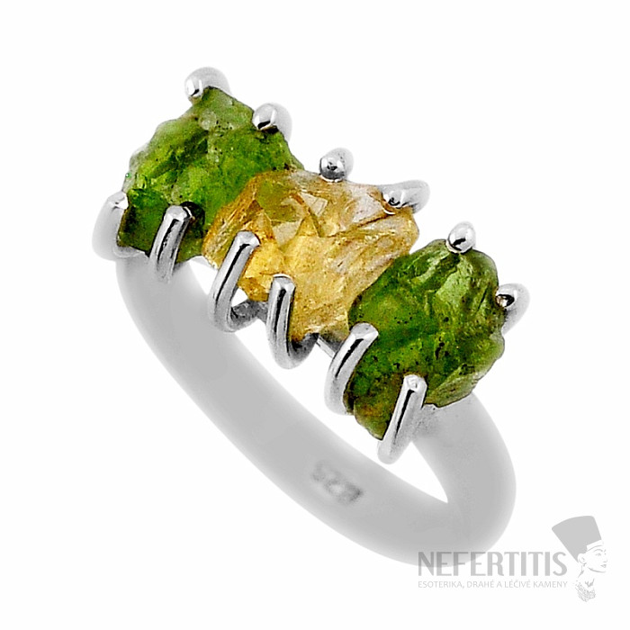 Strieborný prsteň so surovými olivínmi a citrínom. Ag 925. Veľkosť jednotlivých kameňov cca 1 cm. Kupujete priamo vyobrazený šperk.
